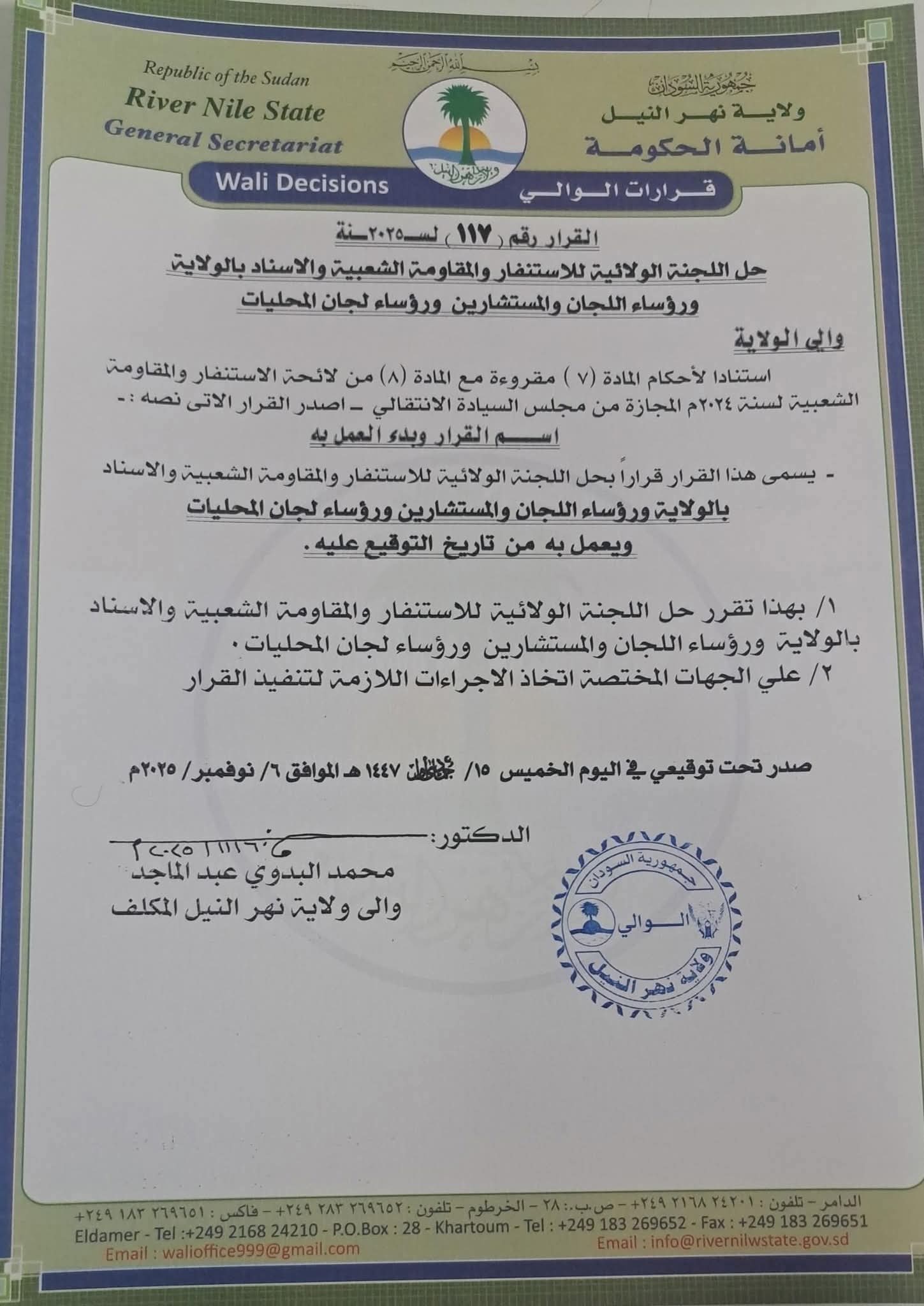 والي ولاية نهر النيل يصدر قراراً بحل اللجنة الولائية للاستنفار والمقاومة الشعبية والإسناد