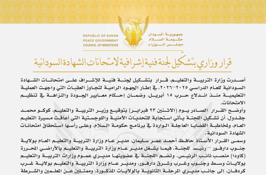 تأسيس : تشكل لجنة عليا للإشراف على امتحانات الشهادة السودانية أخبار – استقصائي أصدر وزير التربية والتعليم بحكومة تأسيس، كوكو